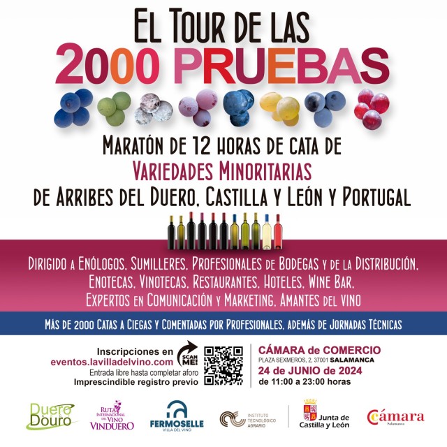 AECT Duero-Douro, desde el proyecto Fermoselle Villa del Vino, en colaboración con la Cámara de Comercio de Salamanca y el Instituto Tecnológico Agrario de la Junta de Castilla y León (ITACyL) organizan, el próximo 24 de junio, la iniciativa 'El tour de las 2.000 pruebas', una maratón de 12 horas de catas de vinos elaborados con variedades minoritarias en Arribes del Duero, Castilla y León y Portugal.