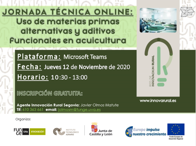 - JORNADA AGROTECNOLÓGICA. INCLUSIÓN DE FUENTES PROTEICAS DE ORIGEN ANIMAL Y VEGETAL EN PIENSOS PARA PECES. (21 de febrero 2019, Segovia)